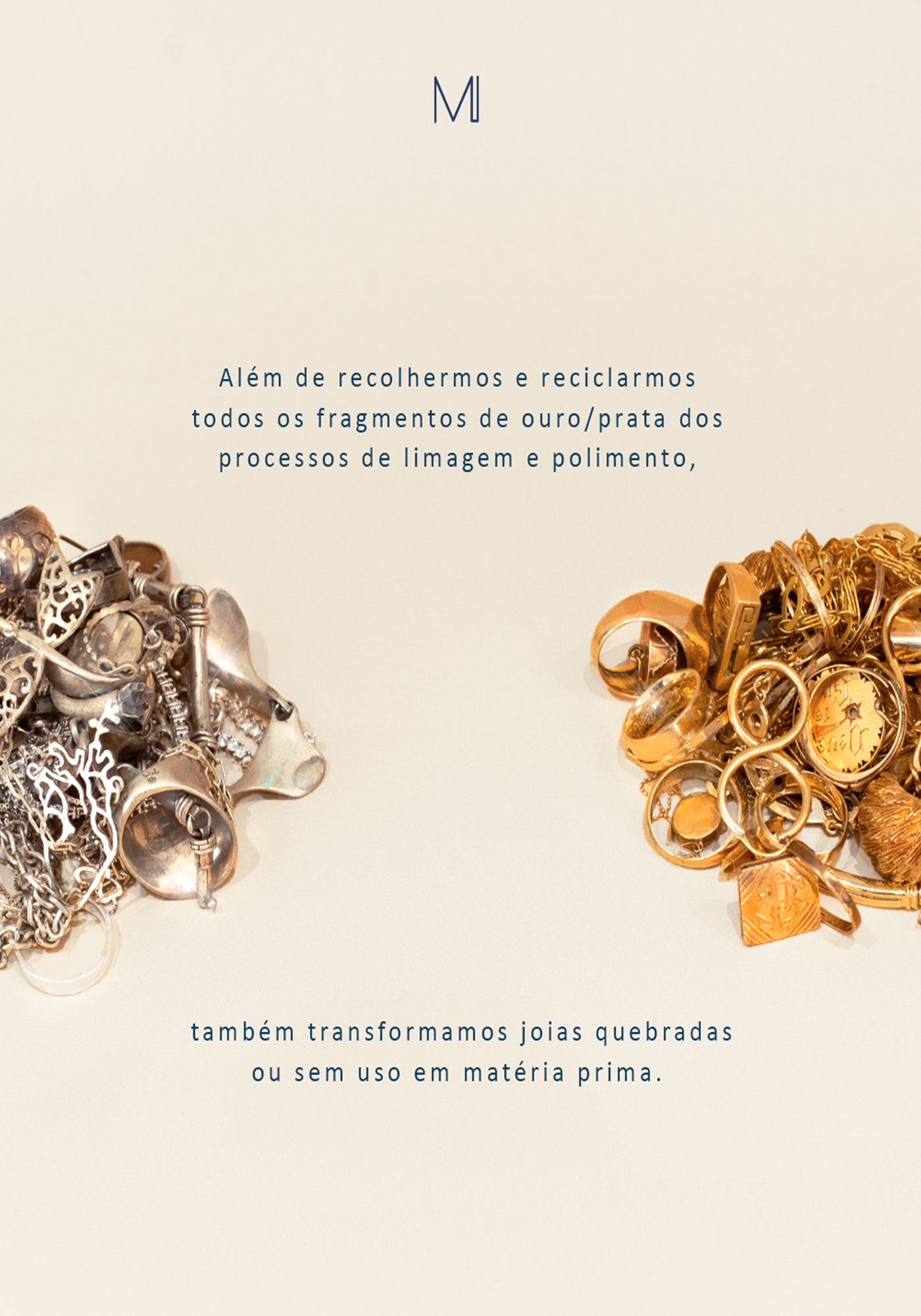 Participe de nosso programa de reciclagem de joias: envie suas peças antigas, receba crédito na loja e apoie nossa missão de sustentabilidade.