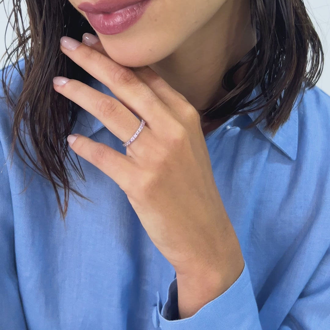 Esta meia aliança em ouro 18K é uma joia que une delicadeza e sofisticação. Seu aro é composto por safiras cuidadosamente alinhadas, que se destacam pelo tom rosa e luminoso das gemas. O arranjo das pedras cria um efeito visual leve, moderno e equilibrado.