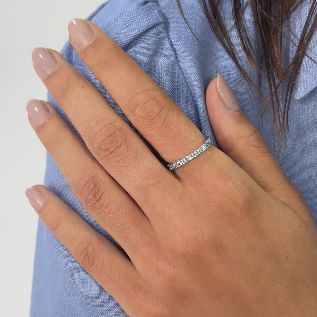 A Meia Aliança com Topázios Sky em ouro 18K é uma joia que une delicadeza e sofisticação. Seu aro é composto por Topázios Sky cuidadosamente alinhados, que se destacam pelo tom azul claro e luminoso das gemas. O arranjo das pedras cria um efeito visual leve, moderno e equilibrado.